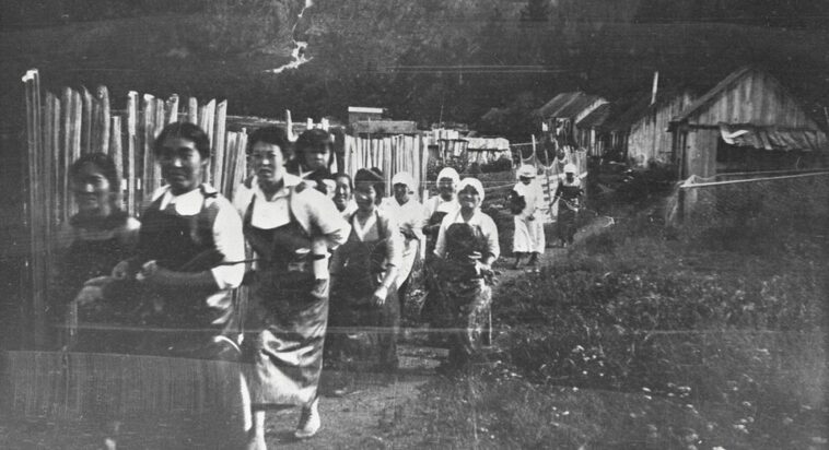 The women walk toward the cannery at Kimsquit Inlet, aprons tied against their waists, scarves pulled tight against the morning air. One carries a child. A few glance sideways. Most look straight ahead.